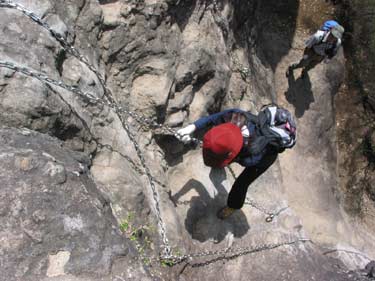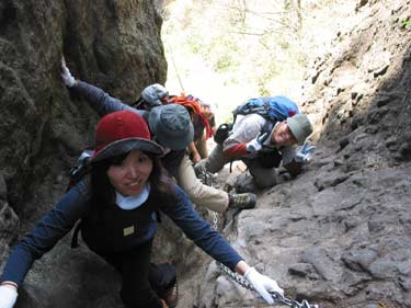 そこから登り一方の道をしばらく行くと鉄階段で岩稜を登る場所に出合う。