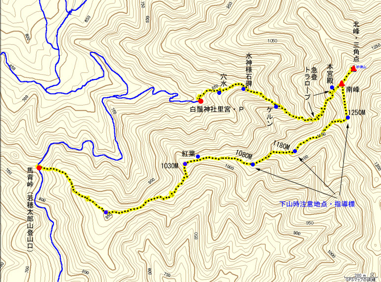 (計曲線 50M 主曲線 10M) 白鬚神社駐車場標高/814M 標高差/480M 総歩行距離/5829M |
