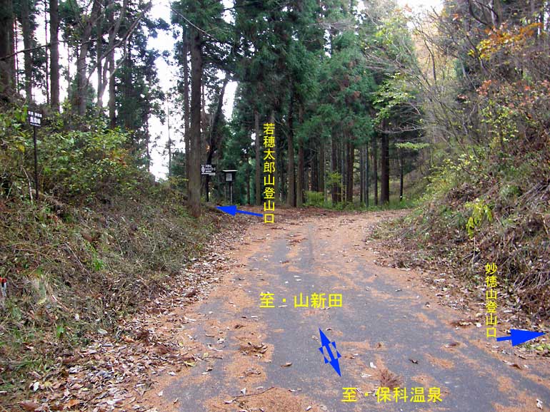 馬背峠/若穂太郎山へ最短で登ることができる登山口 この林道は完全舗装だが道幅が狭いうえ落ち葉が多いのでスリップに注意 |