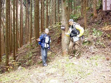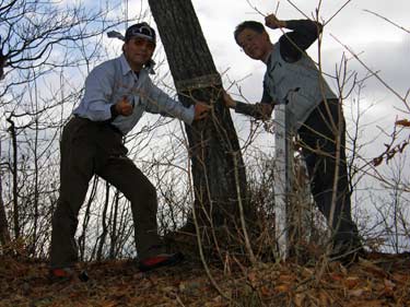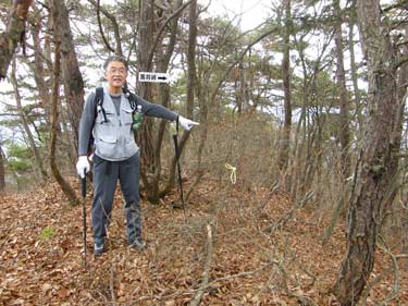 踏み跡の無い雑木林を黄色テープ頼りに登る | 標高1030M地点が見えてきた | |||