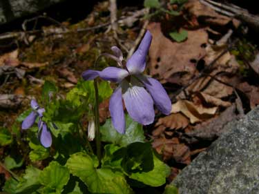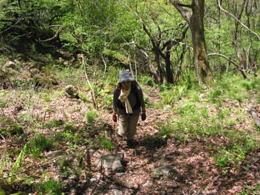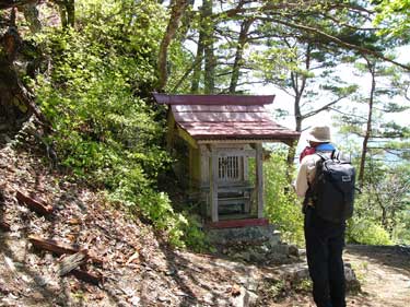 白鬚大明神の立札横から入り、白鬚神社の石祠前を横切って杉林を緩く下ると林道からの