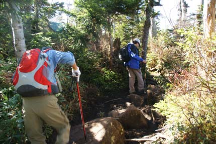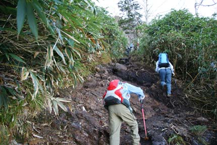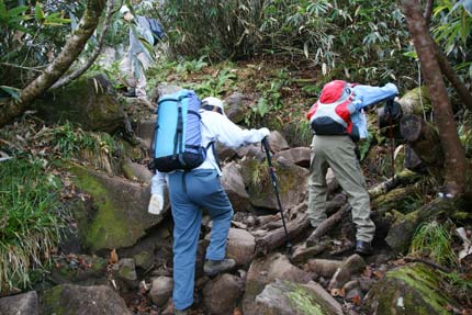@木の根っ子トンネル A四合目・水場 B五合目 C水場 Dクサリ&ロープ E六合目 F七合目&ヒカリゴケ