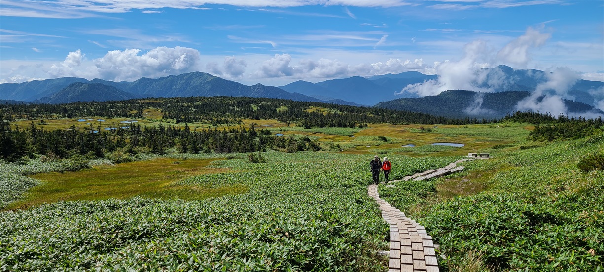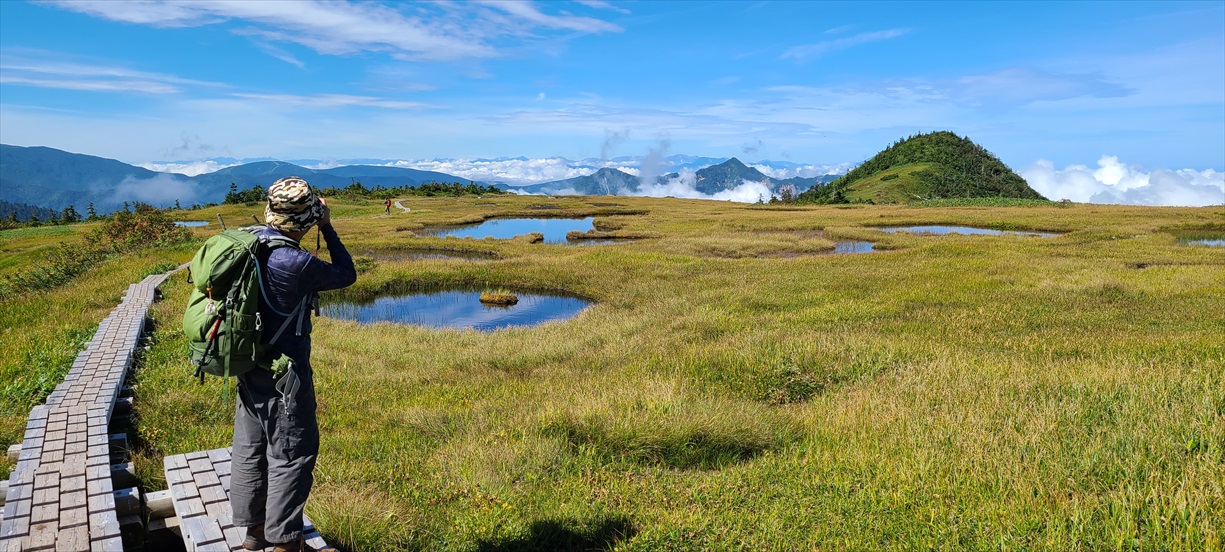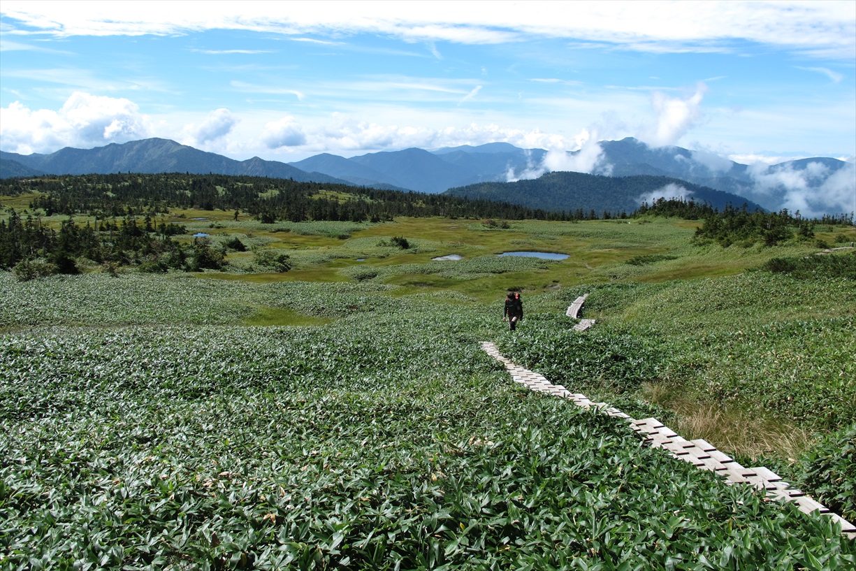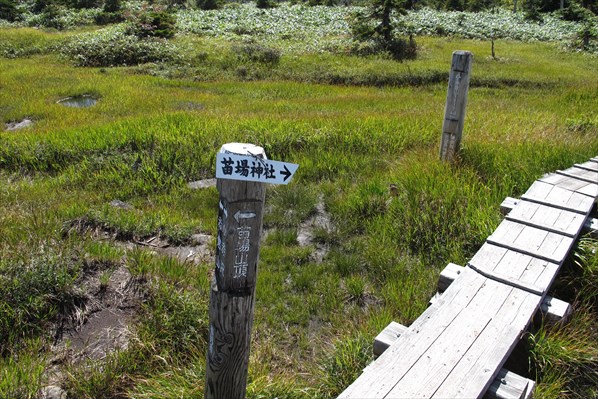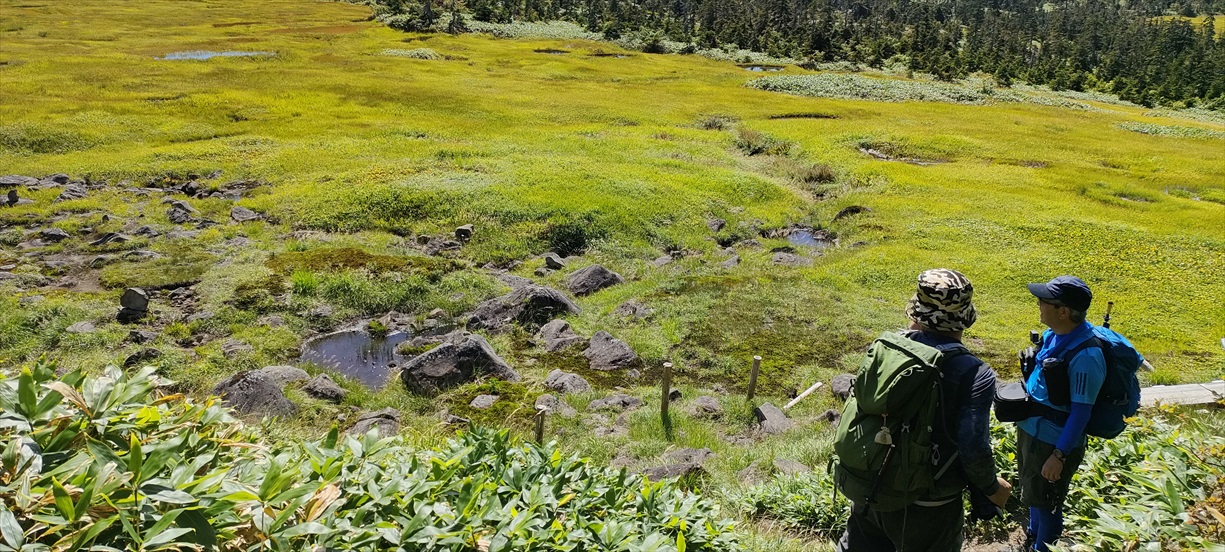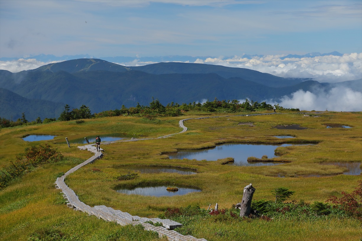 苗場神社より池塘群展望・右隅に見える木道は東尾根経由で赤湯に至る |