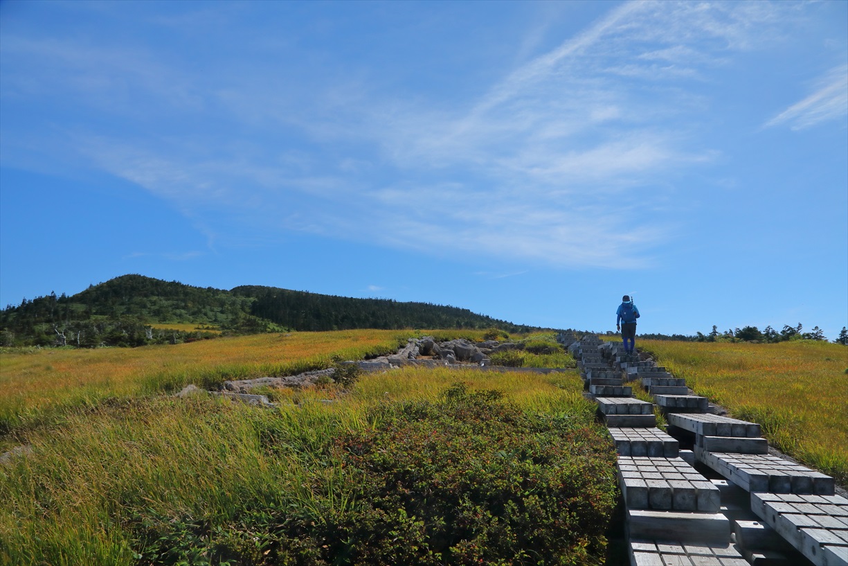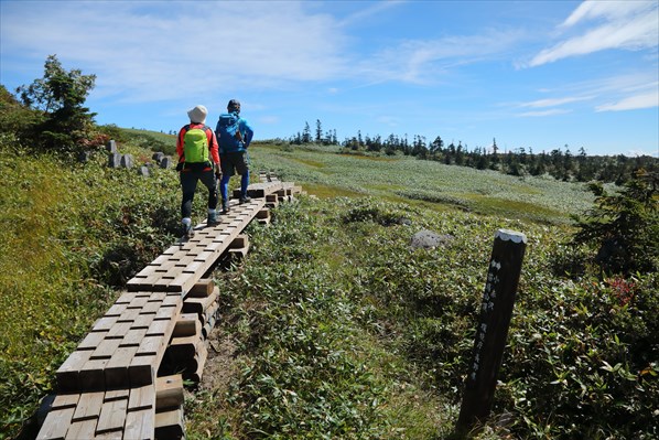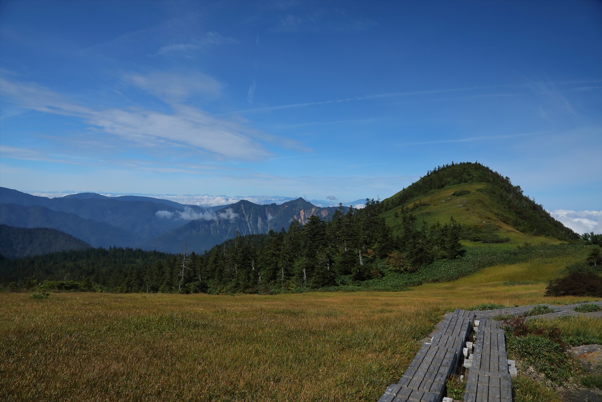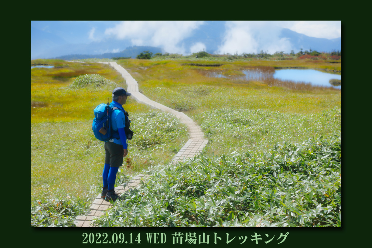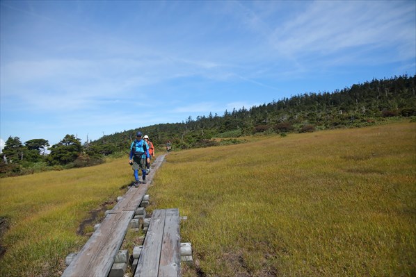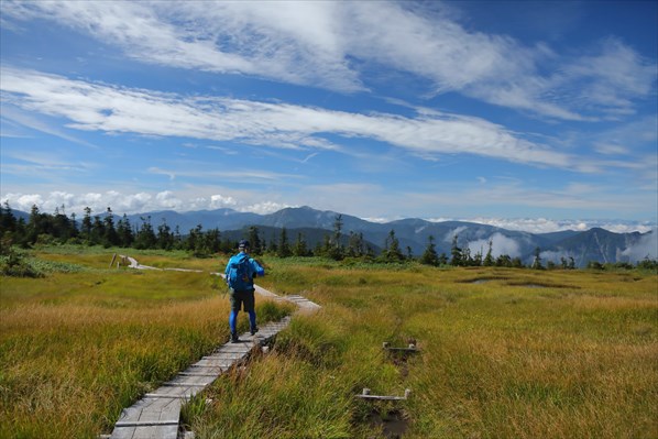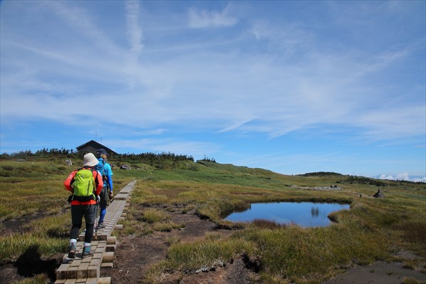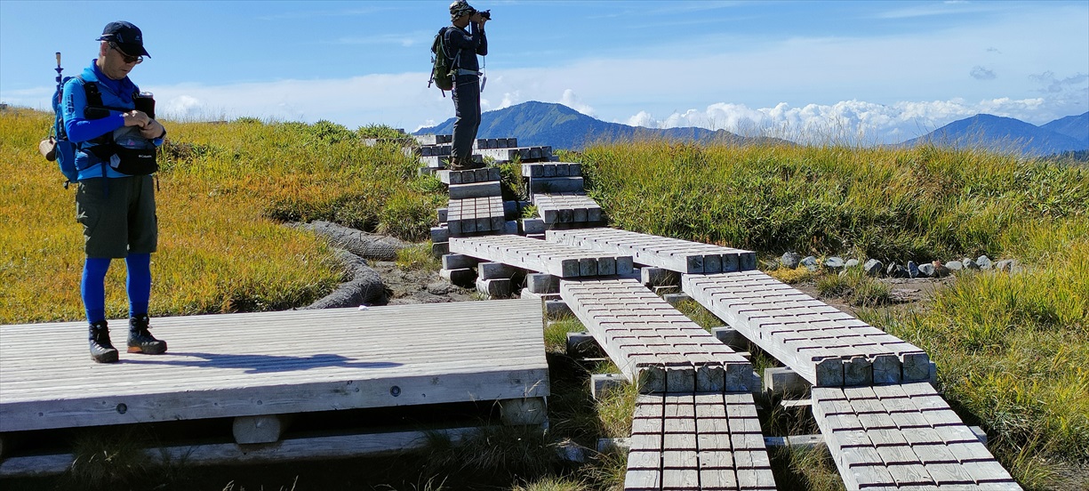 苗場神社より池塘群展望・右隅に見える木道は東尾根経由で赤湯に至る |