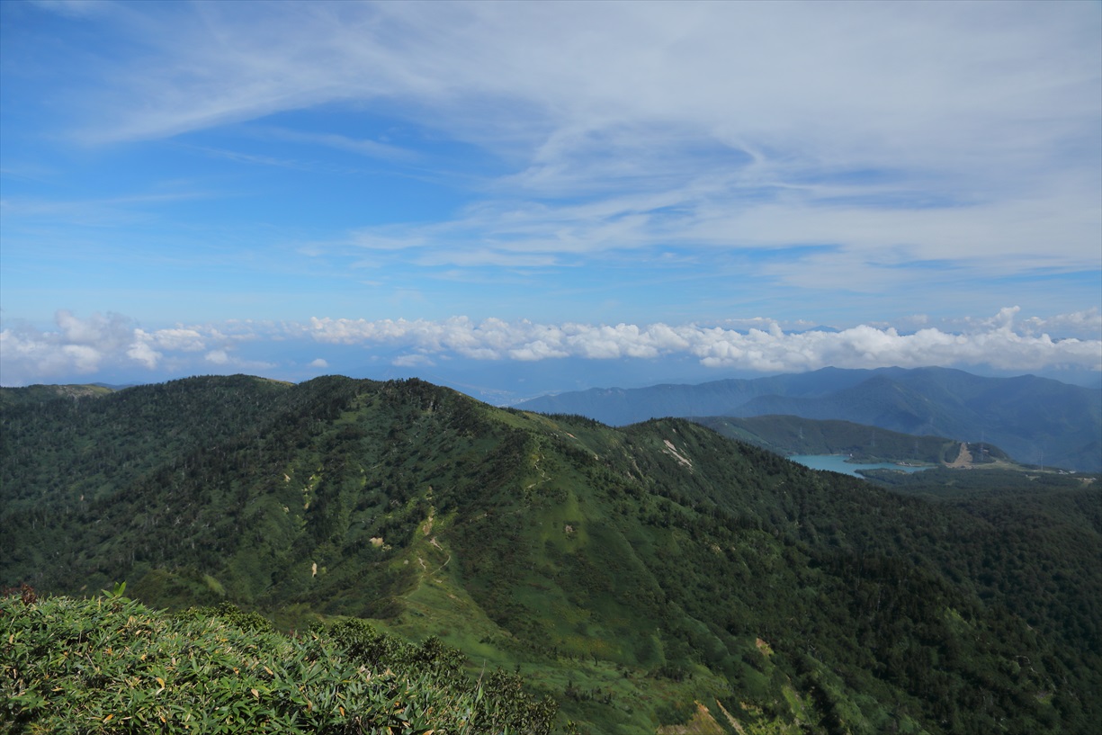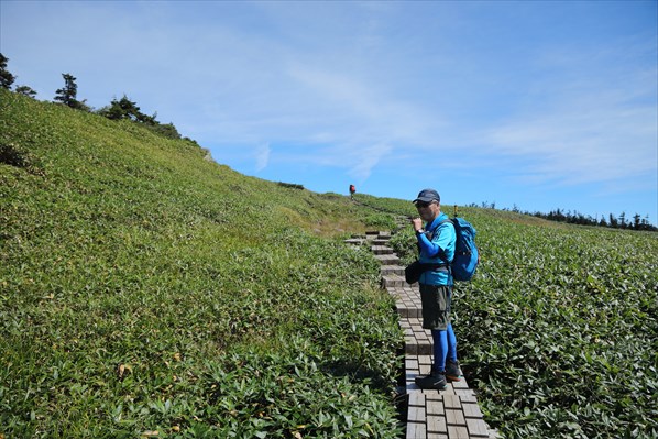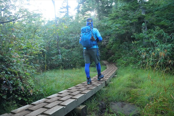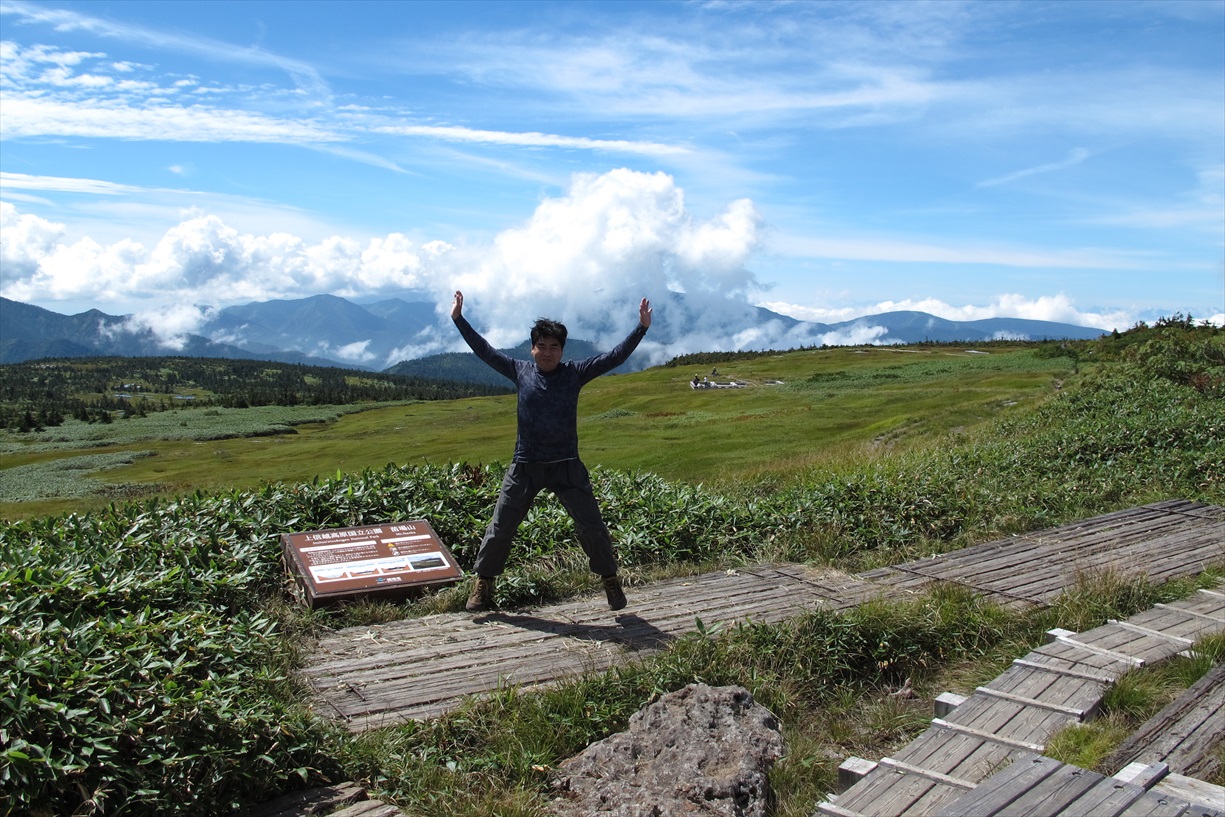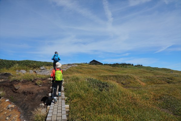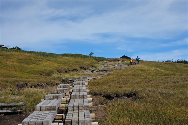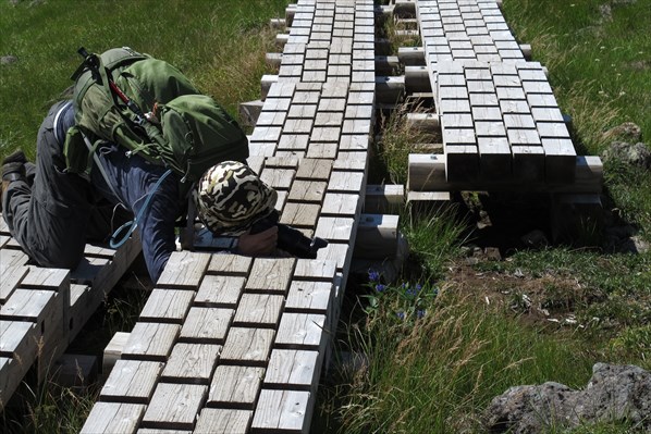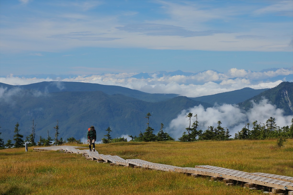 苗場神社より池塘群展望・右隅に見える木道は東尾根経由で赤湯に至る |