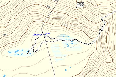 (計曲線 100M 主曲線 20M) 駐車場標高/1224M 標高差/921.3M 総歩行距離/14993M |