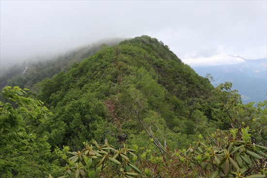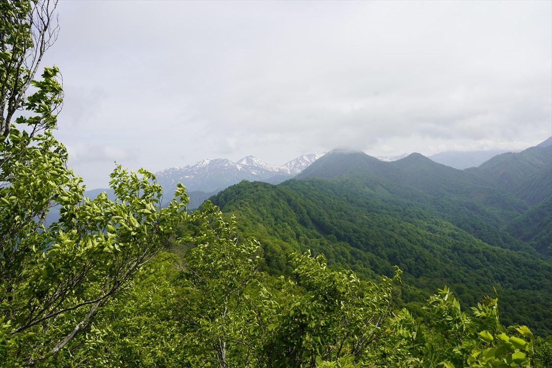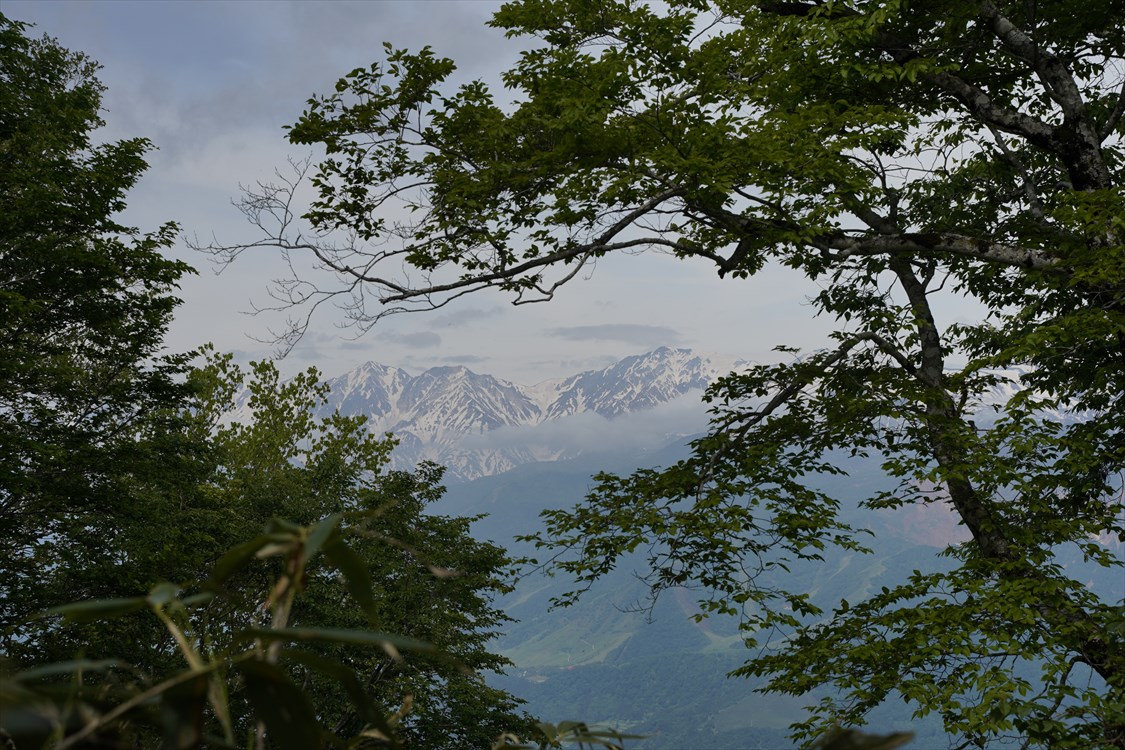 稜線木々の間から北アルプス展望・鑓ヶ岳&白馬岳とおもわれる | ||||