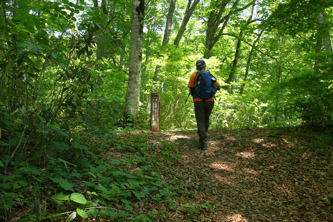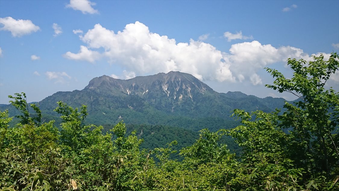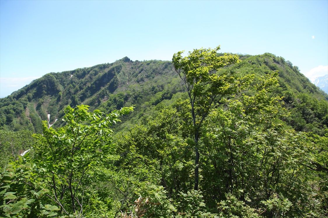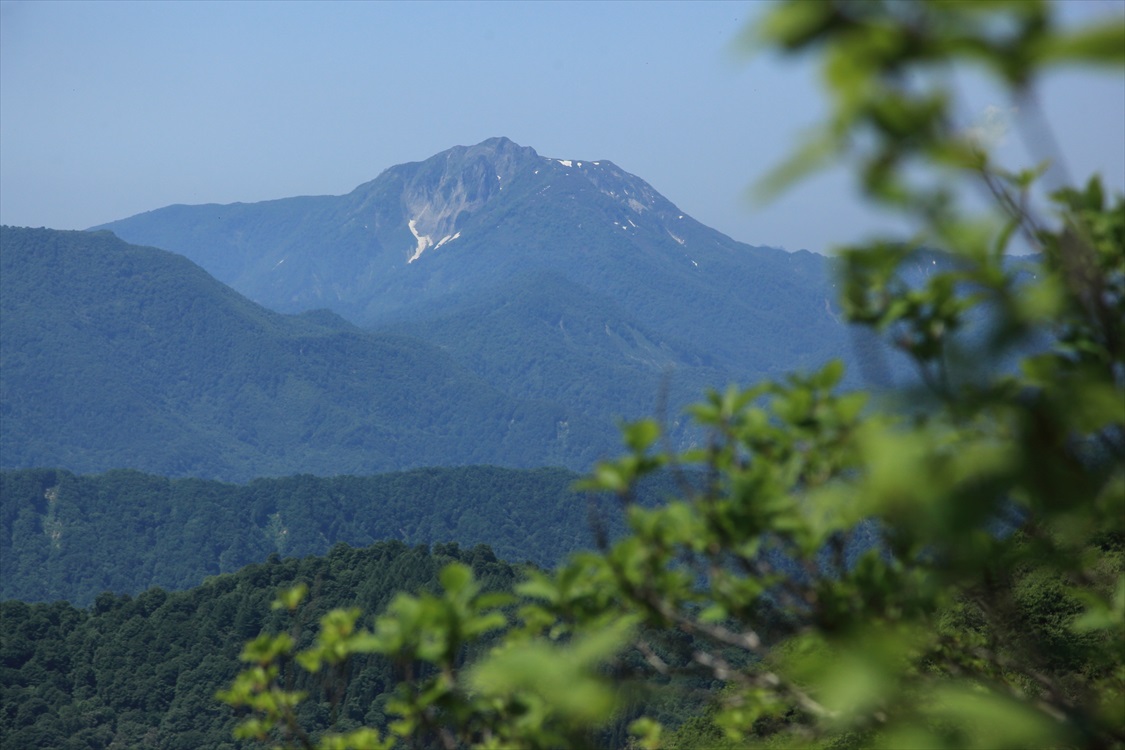 展望とシラネアオイのチェックで標高1700m地点まで訪れる 尖りは奥東山 |