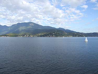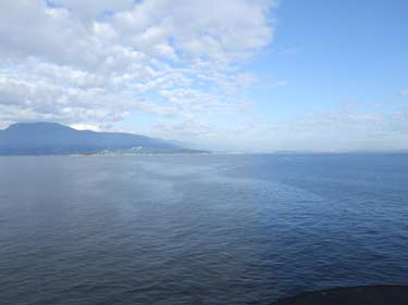 右前方にバンクーバーのビル群が蜃気楼のように見える |