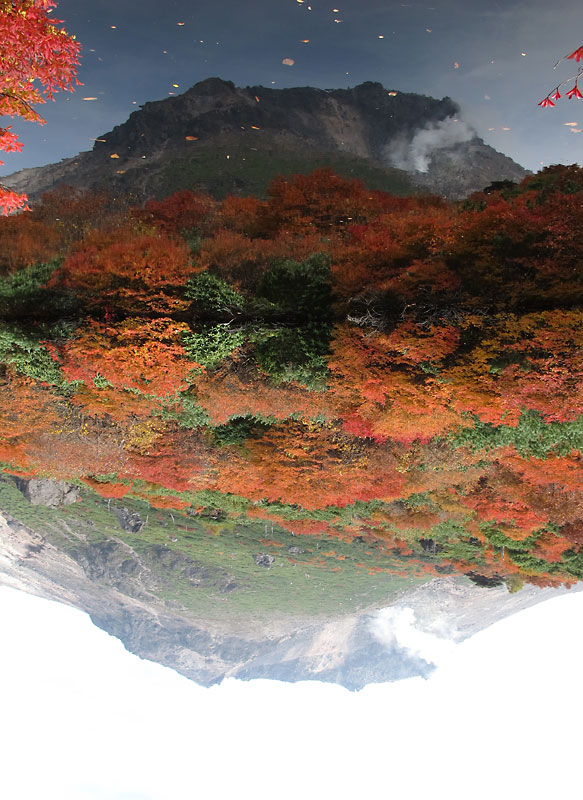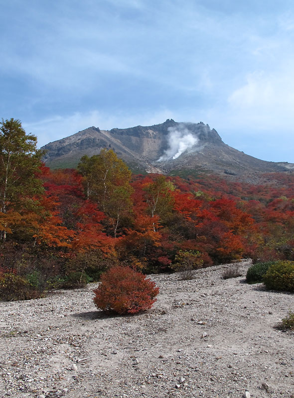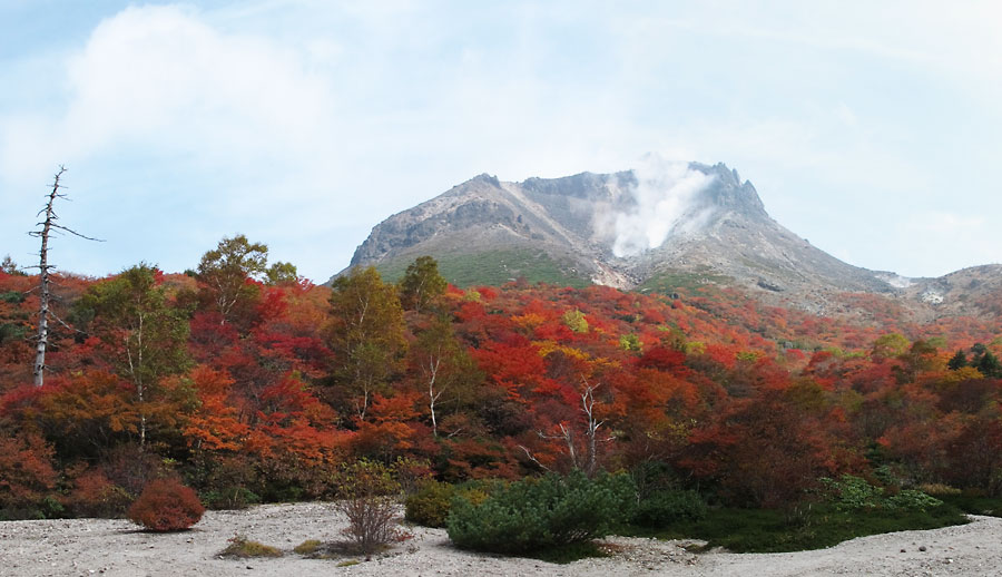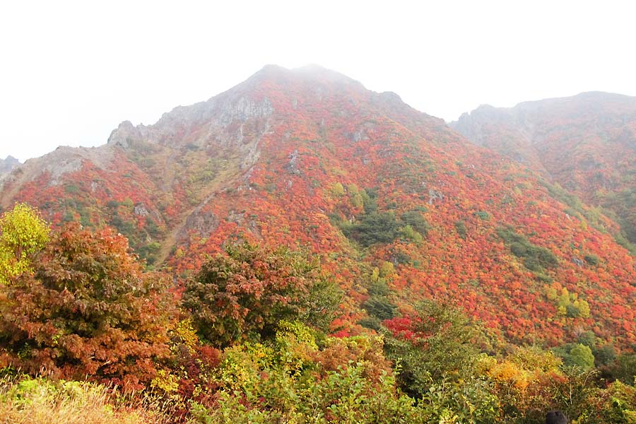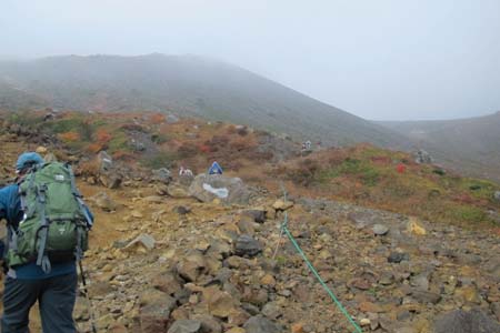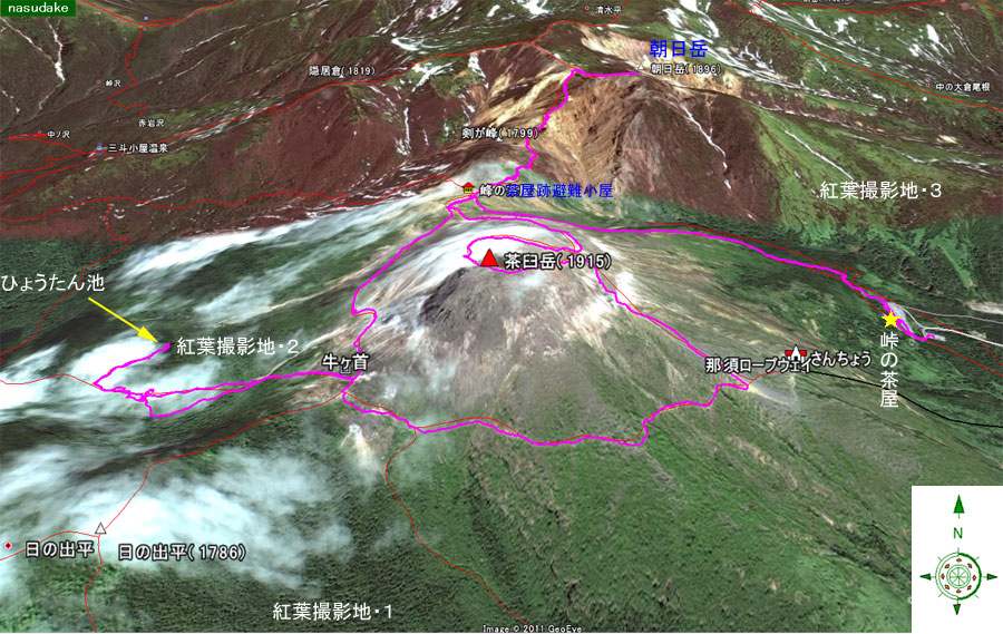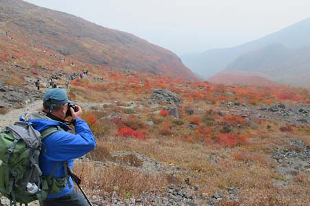 ガスっていたがこれだけ見えれば良しとしよう・・・朝日岳方面の紅葉 鳥瞰図:紅葉撮影地・3 |