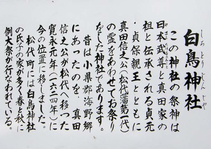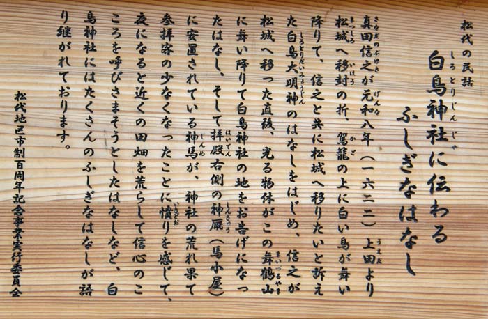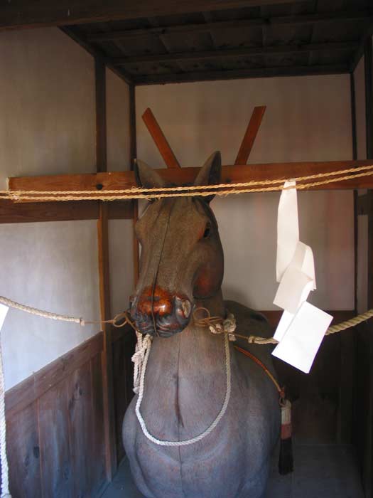 長野市文化財/神馬(じんめ) 1849年に真田幸貫公が諏訪の立川和四郎という名匠に木造の神馬を造らせた。拝殿前右側の神厩に安置されており、 欅材の寄せ木造りの神馬は全身の細毛まで鮮やかに彫られている。 「白鳥神社の由緒」解説用紙より抜粋 |