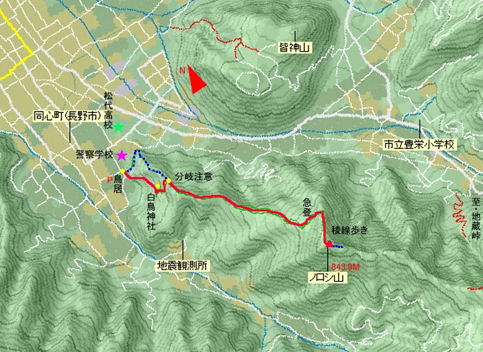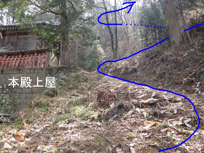 本殿上屋が下に見える(右の場所から撮影) | 前方を右に巻くとノロシ山の尾根筋に出る | |||