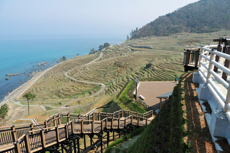 崖のように切り立った海岸に1004枚もの田圃が幾何学模様を描き、季節や時間帯によって異なる風景が楽しめる |