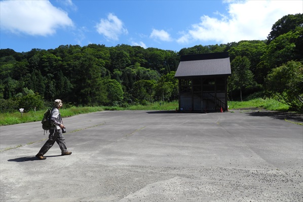 万坂峠・入山者カウンター/袴岳まで2.2` 樹木の隙間から斑尾タングラムの駐車場が見える |