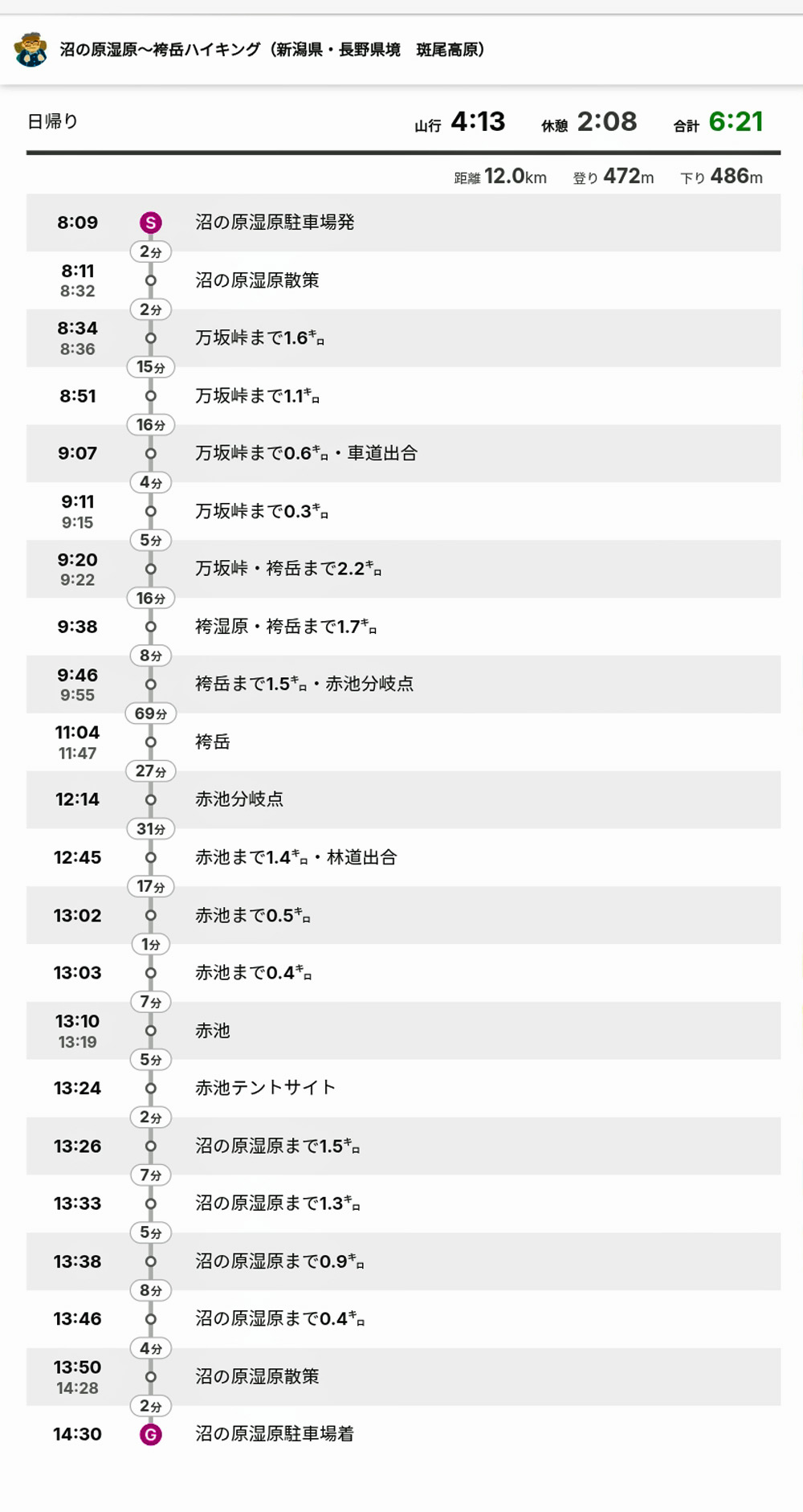 《沼の原湿原〜袴岳コースタイム他》 写真撮影時間20分〜100分含む |