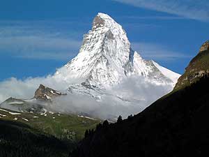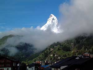 7日目:ゴルナグラード まだ天気が悪い。せっかく来たのに、マッタ ーホルンは見え隠れ。恥ずかしがっている のかなあ。なんてのんきなことも・・・ 前の日は雪が降りました。 |
