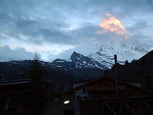 8日目:ツェルマット 朝5時の起きて、旦那さんが散歩。山が見え るので、起こしに来て、一緒に教会まで散歩。 まだまだ暗い中、多くの散歩者がいました。 |