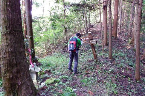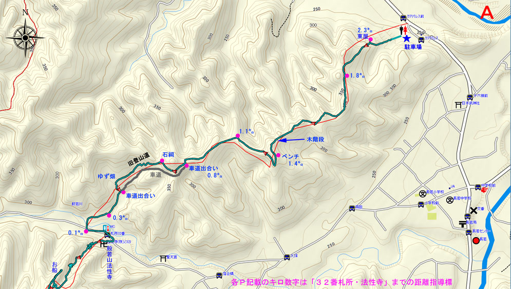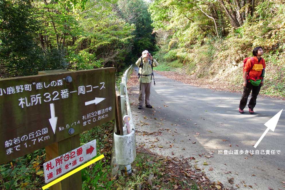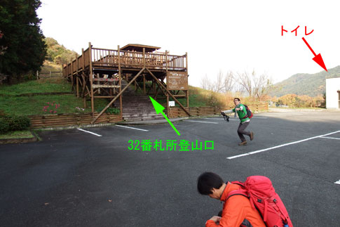 いきなり登山口から階段歩き | 東屋 32番札所まで2.3㌔指導標 |