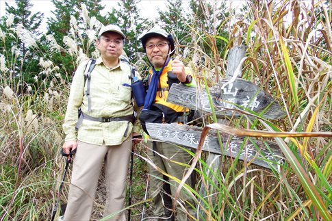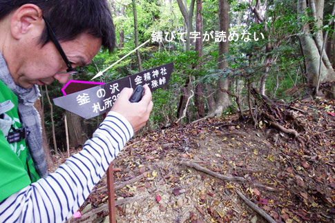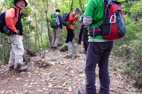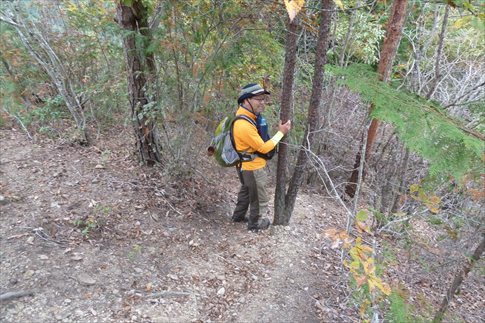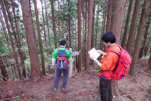 ここが布沢峠と思われる/錆びついたT字型指導標が目印/mizuoさんナビチェック中 | ||||