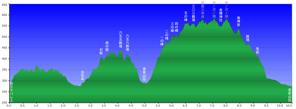 旧クアパレスおがの駐車場標高/256M 標高差/334M 上り累計/1027.6M 総歩行距離/10474M | ||||