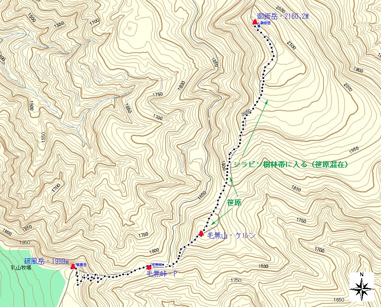 毛無峠まで戻り破風岳(1999M)を目指す | ||||