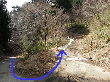 峠では指導標(山頂まで1.7km)に従いチェーンゲート脇から未舗装の林道に入る。