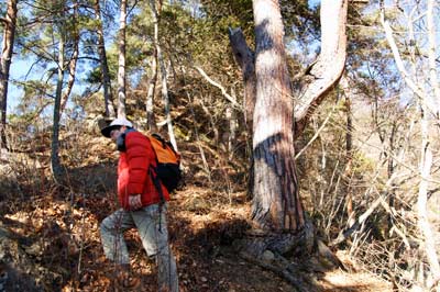 痩せ尾根の急坂に落ち葉が積もる |