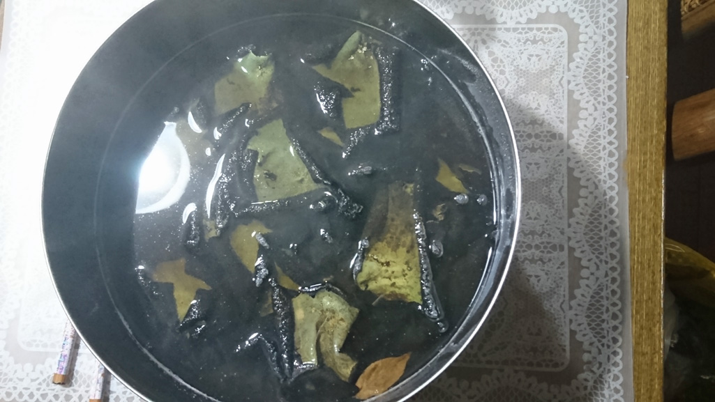 40年50年の汚れを落とす必要があるため、先ず熱湯でヒタヒタにすると日光を浴びていた表面が緑色になります。 ★ぬるま湯程度まで冷めたら流水で濁り水がなくなるまで何回も何回も「もみ洗い」をします (このもみ洗いは最終行程でもおこないます) |