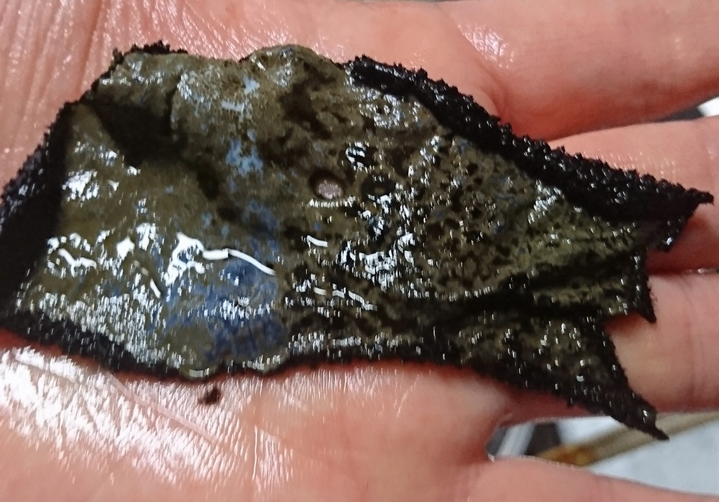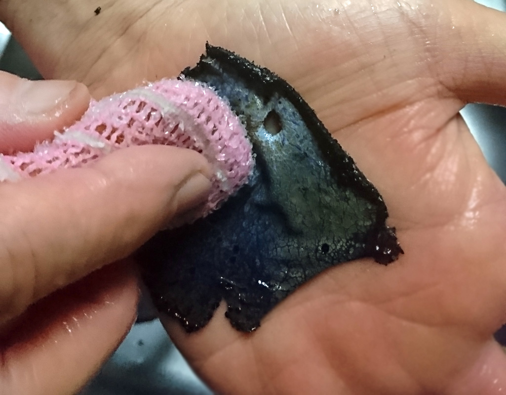 表面に付いた50年分の汚れはひとつひとつこのように擦って落とします。 強くこすっても千切れないので大丈夫ですよ〜(^_^)v ★これが一番手間と時間のかかる下処理です(笑) |