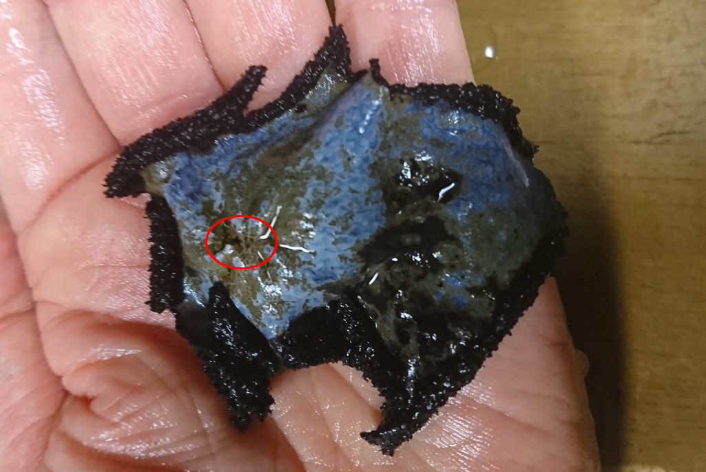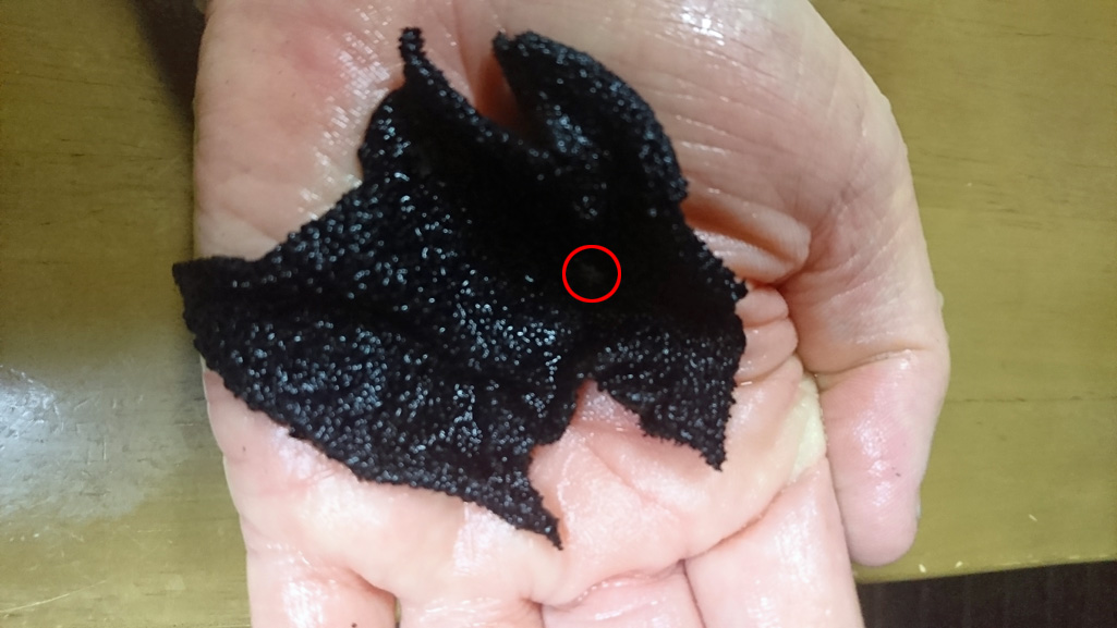 岩にへばりついている裏側部分 赤丸はキノコでいう「石づき」の箇所なので手で取り除く |