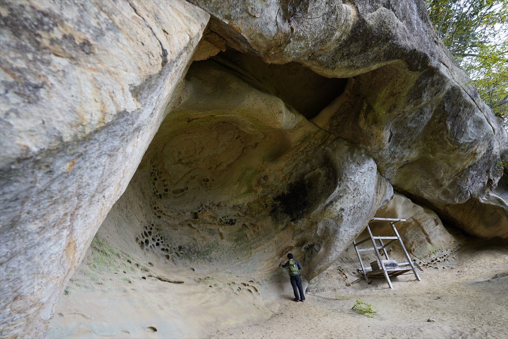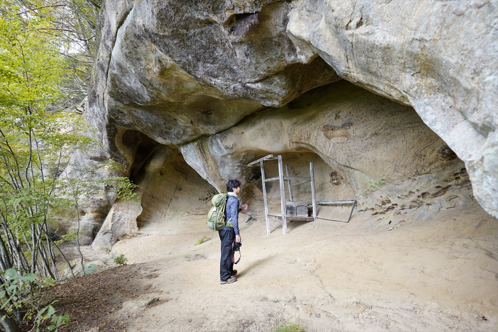 大姥神社奥宮の大穴 大姥と金太郎の住居・洞窟奥の岩の割れ目に耳を当てると「海の音」が聞こえると伝わる |