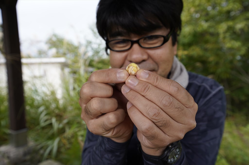 栗って生で食べられるの〜? と、疑心暗鬼な山浦さん 爺、ガキののころは山栗や山クルミは貴重な食材! 渋皮を前歯でガリガリって削ってポリポリと食べると美味しいです♪ |