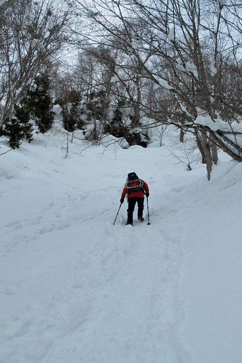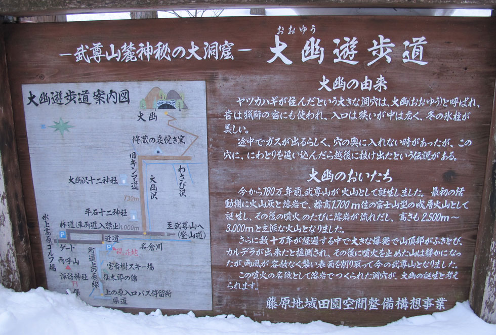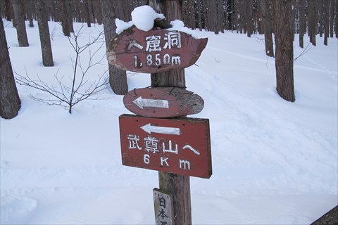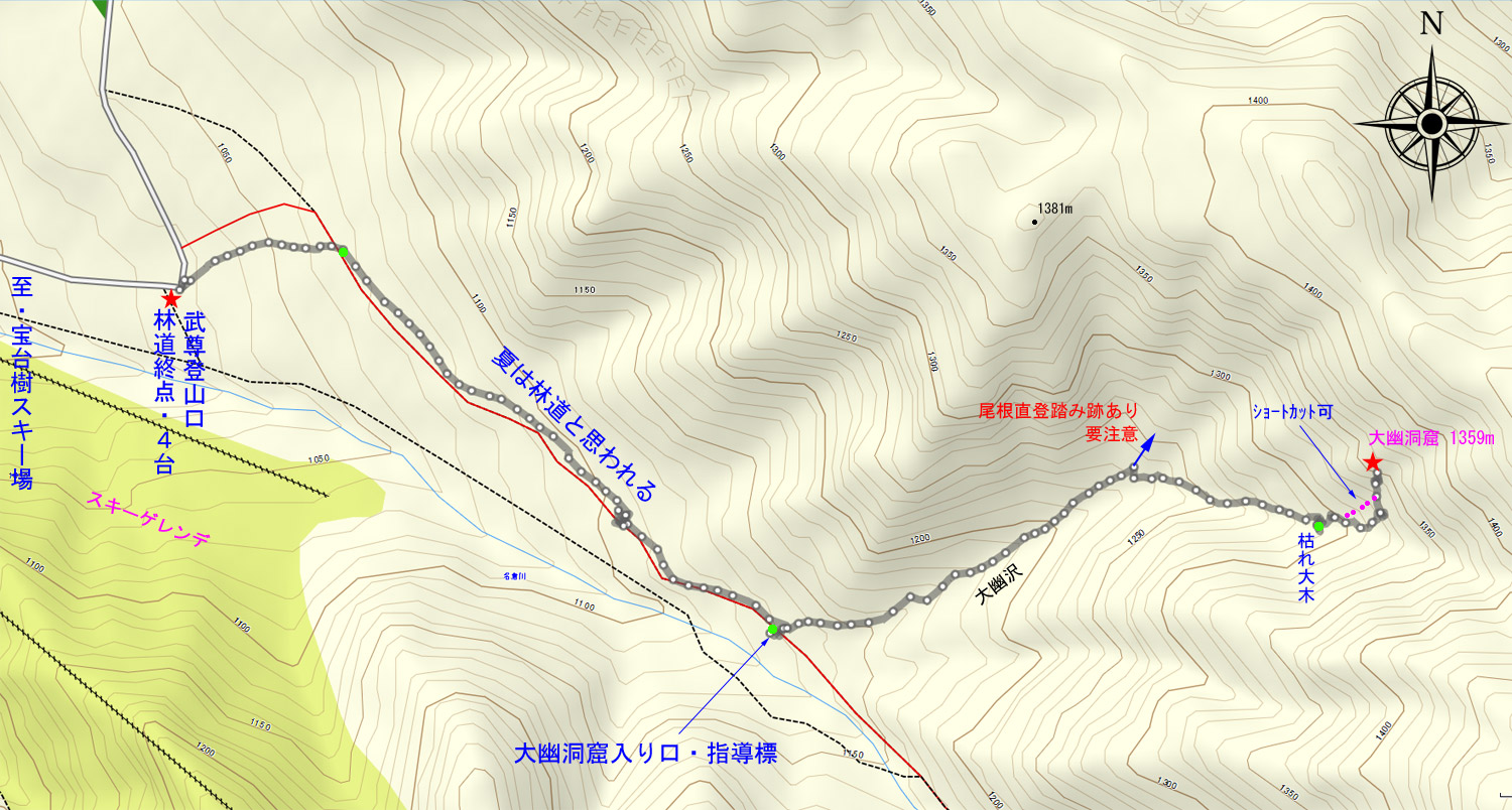 大幽洞窟発 9:19 ~ 枯れた大木 9:25-32 ~ 大幽沢&洞窟入り口指導標 9:48
