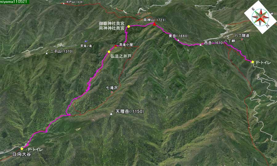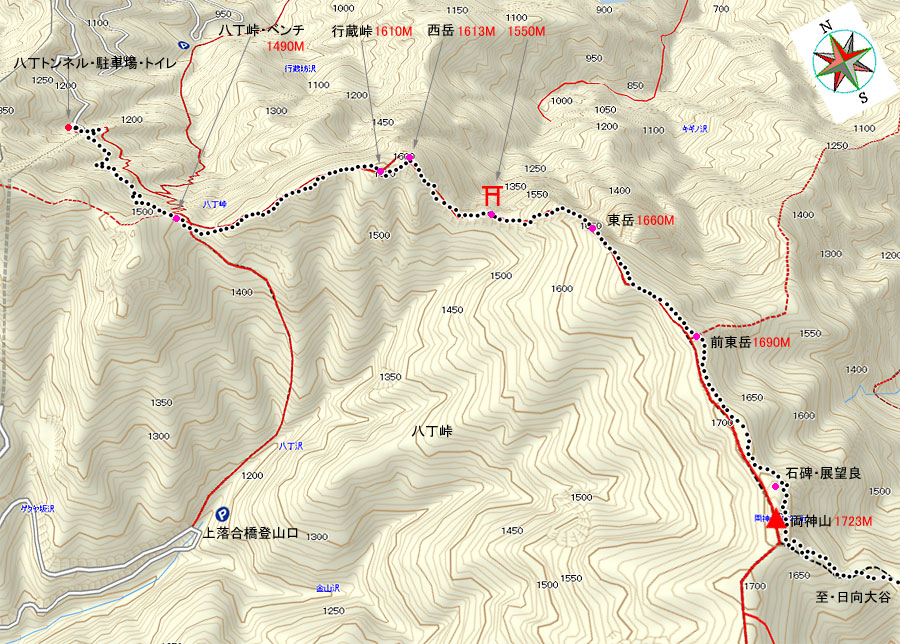 (計曲線 50M 主曲線 10M) 日向大谷駐車場標高/660M(八丁トンネルP標高・1215M) 標高差/1063.5M 総歩行距離/10823M |
