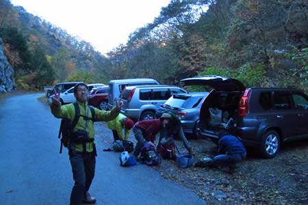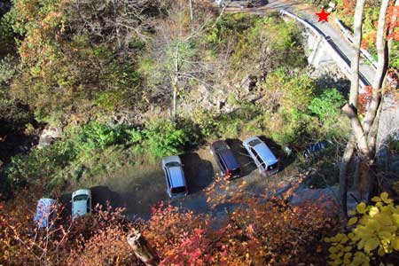 崖の真下に上落合橋駐車場と登山口(星印)がみえる | 駐車場に到着 (^O^)v | |||