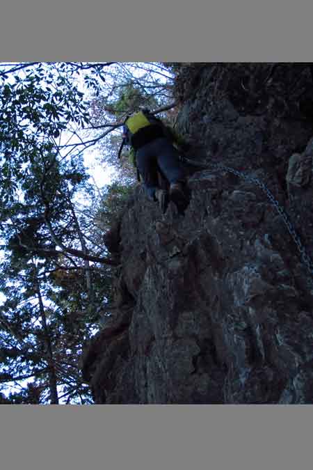 ここで二番目の下りクサリ場 背後の岩壁を登るですよ〜〜♪ |