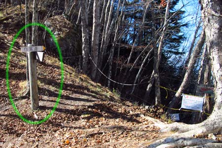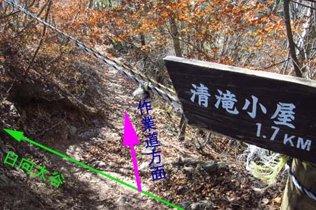 作業道はこのトラロープをくぐって梵天尾根方面へ向かう | 作業道入り口の指導標 | |||