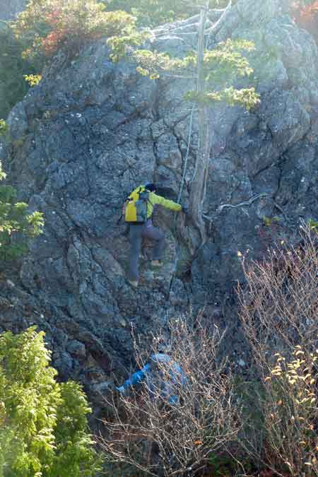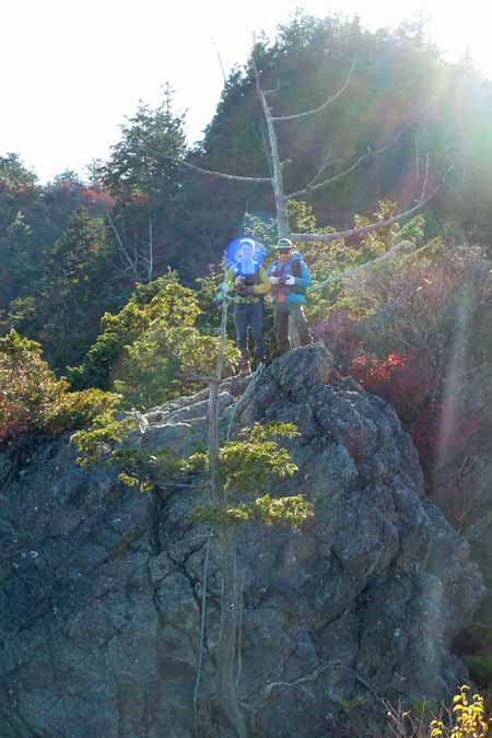 左の写真と比べて矢印の登山者頑張っています♪ (この岩頭上部に龍頭神社奥宮が祀られている) |