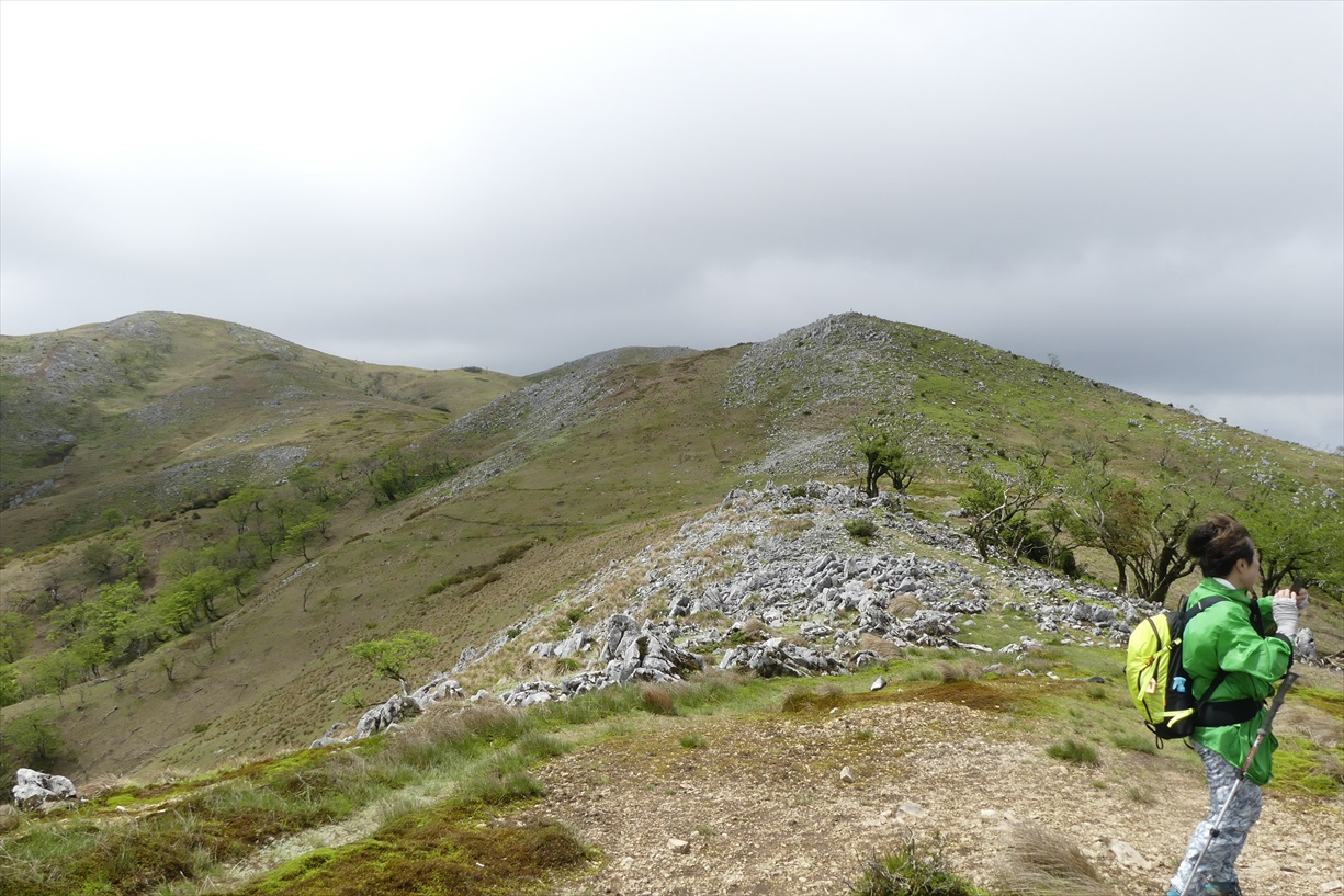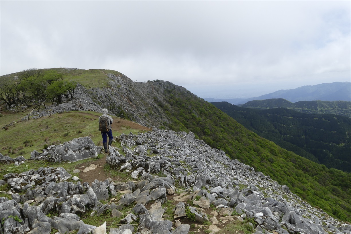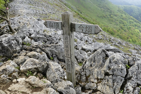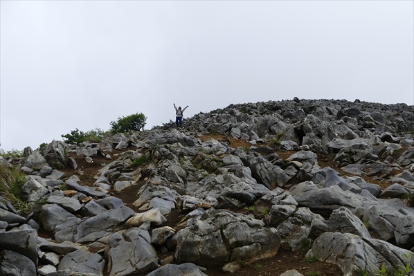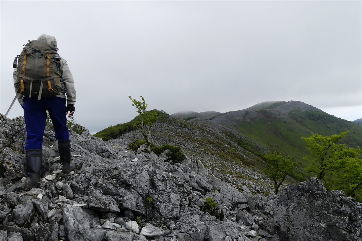西南尾根をドンツキまで行って左カーブした先が最高点ピークと霊仙山 体重70㌔近い爺でもふらつくほどの強風が吹き荒れている (ノД`) |