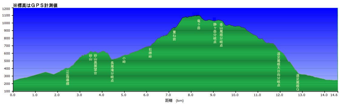 有料駐車場標高/241m 標高差/858.3m 累積標高/1382m 総歩行距離/14589m |