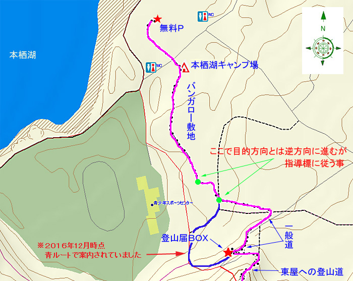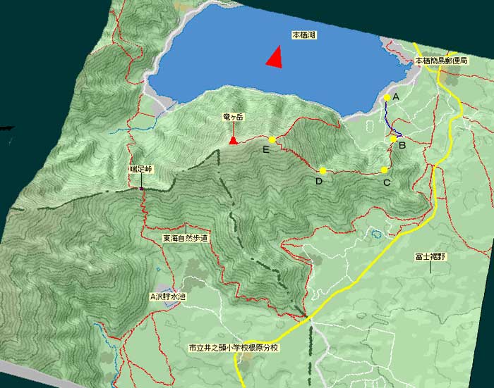 A・本栖湖キャンプ場&竜ヶ岳登山駐車場 B・登山口 C・第一VP(ベンチ) D・東屋&石仏 E・本栖湖分岐点 青いルートは本栖湖キャンプ場内 |