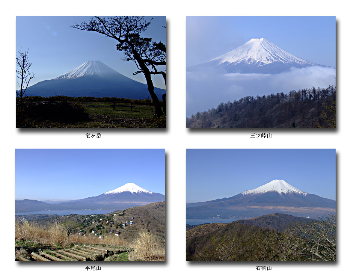 竜ヶ岳・三ツ峠山・石割山・平尾山の四山から望む富士山 | ||||