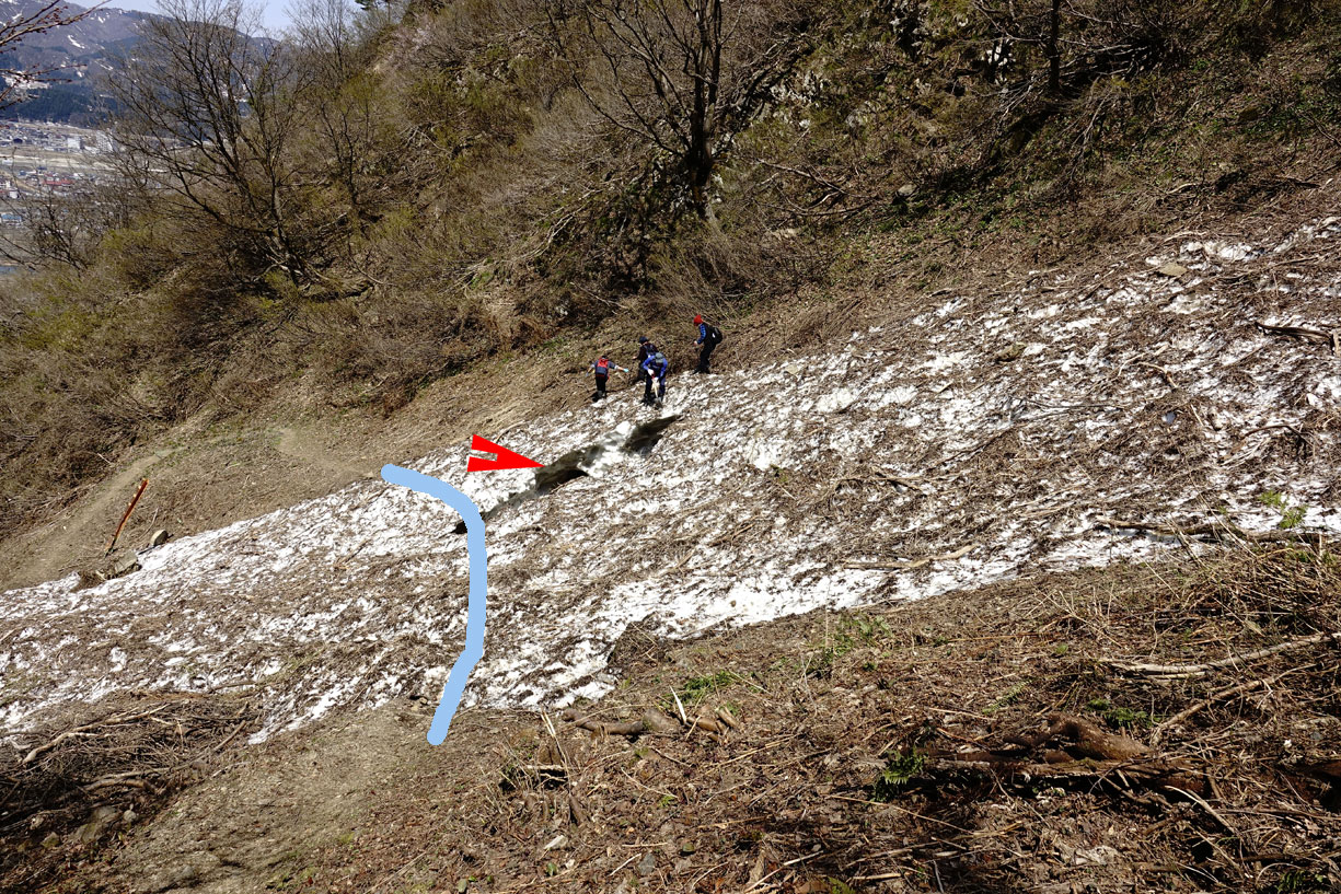 青線=通常ルートだがクレパス擬きがあり安全と思われる上部を慎重に通過 |