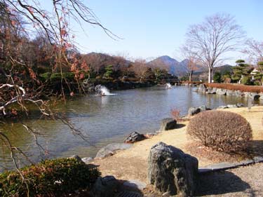 御荷鉾の山々を背景に1500トンの三波石を用いた池泉回遊式庭園 らくだコブの山が御荷鉾山 |