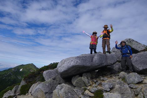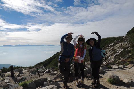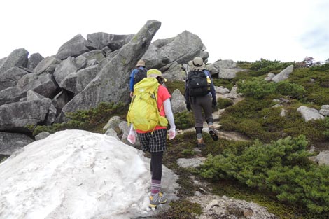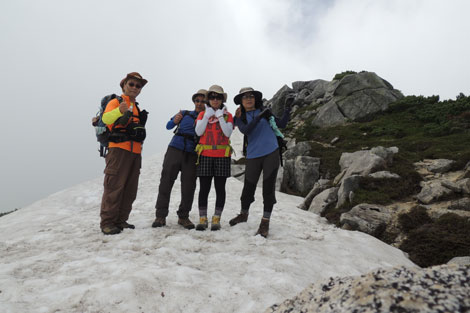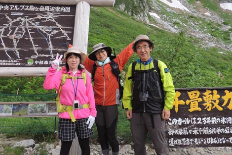 千畳敷カールをバックに 初参加・ゆうこりん、細井さん、2回目参加の荒井さん |