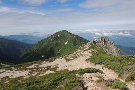 シナノキンバイと空木岳方面の稜線 | 前方の岩稜が三ノ沢岳山頂 | |||