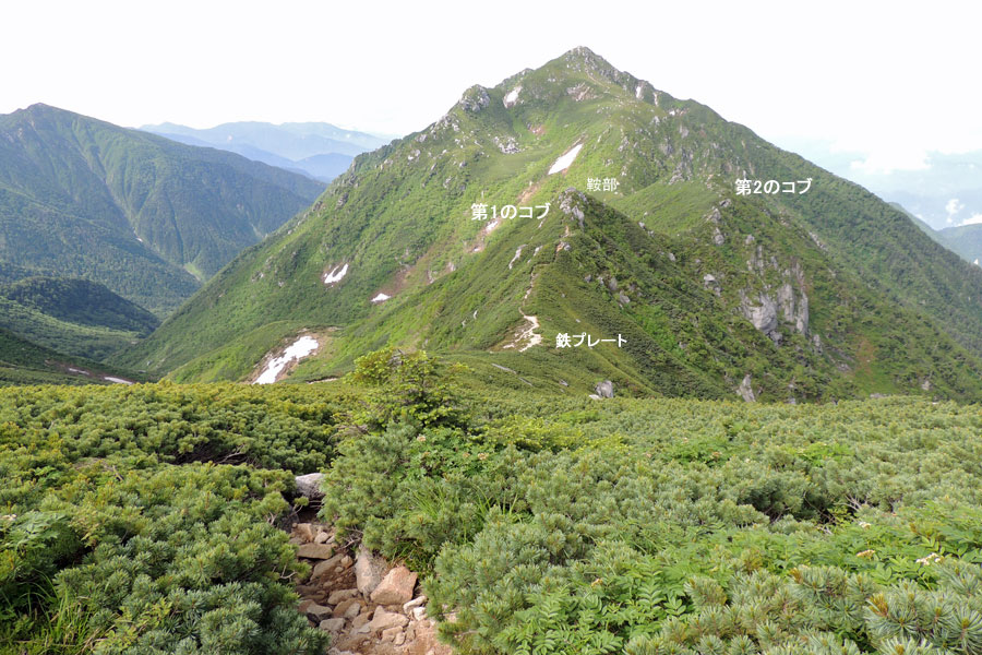 第一のコブ手前でなだらかな稜線となり、旧指導標と思われる鉄プレートが立つ | ||||