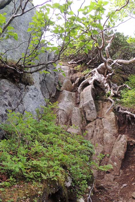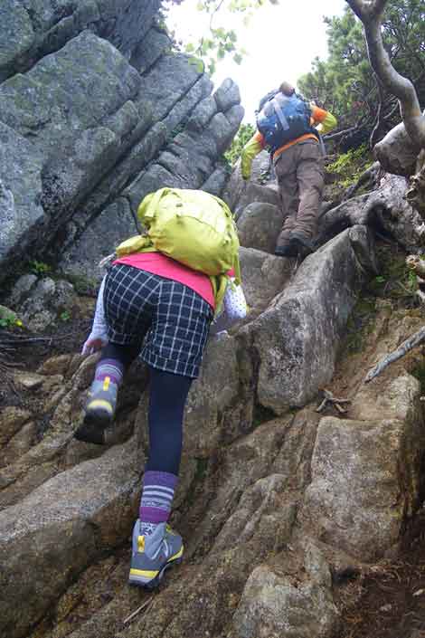 鞍部通過後に現れるこの岩場をクリアすれば快適な尾根筋歩きとなる | ||||