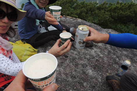 花崗岩の大岩でランチタイム 荒井さん持参のNAビールでカンパ〜イ!! |
