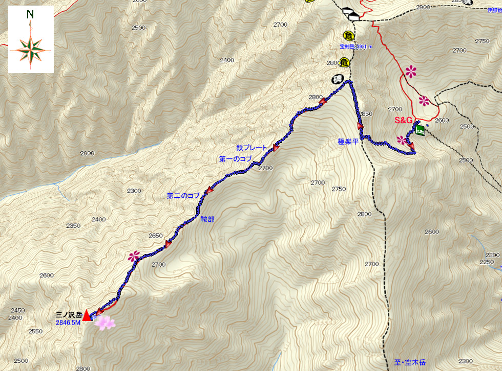 (計曲線 50M 主曲線 10M) RW山頂駅標高/2650M 遭難碑分岐点標高/2887M 三ノ沢岳標高/2846.5m 標高差/237M 総歩行距離/7159M |